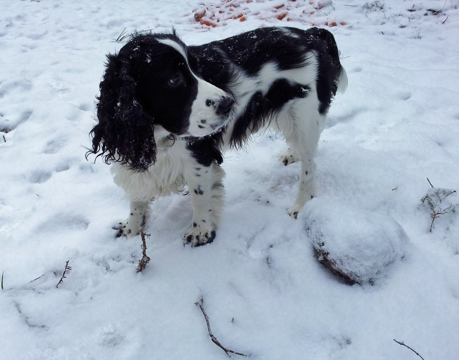 Till exempel idag på promenaden var marken strösslad med morötter igen!! Attans! Någon vill åt mitt huvud, tänkte jag förskräckt och kollade bara snabbt att det inte var korvar i alla fall. Sen ignorerade jag rötterna för jag tänker inte bli förledd till att gnaga på dom.Den lättlurade fårskallen hade inte piggnat till, trots dom utspridda frestelserna. Han var insnöad så han kanske inte kände doften.